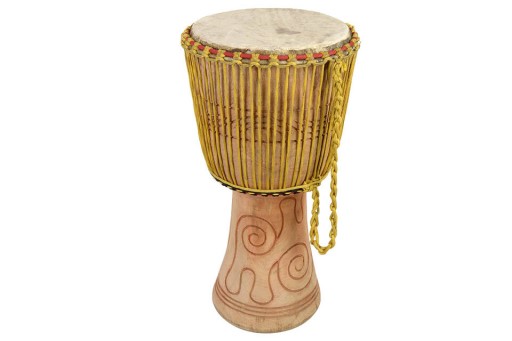 Oryginalny, afrykański bęben Djembe 12" ( średnica górnego naciągu około 12 cali ). Ręcznie wykonany w Ghanie z lokalnego drewna Mansonia. Naciąg z prawdziwej koziej skóry - sznurowany do korpusu. Podane w calach średnice są przybliżone - nie są komputerowo wycinane na podstawie szablonu i zależą od średnicy pnia drzewa, z którego wyżłobiono kadło. Zewnętrzna część jest ozdobiona rzeźbionym ręcznie wzorem.