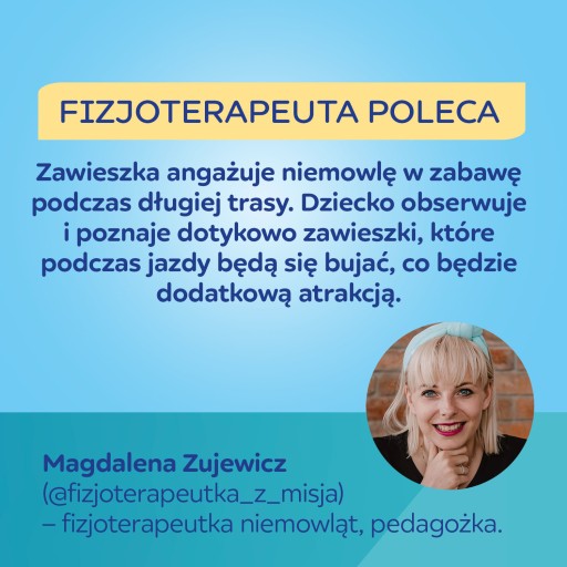 - Zabawki dołączone do zawieszki pomagają rozwijać umiejętności motoryczne (chwytanie, ciągnięcie, potrząsanie), aktywizują zmysł słuchu (szeleści, grzechocze), wzroku (kontrastowe kolory, lusterko) i dotyku (różnorodne faktury).