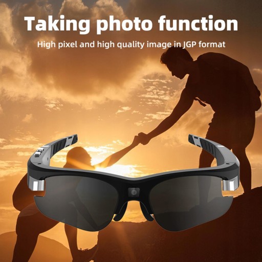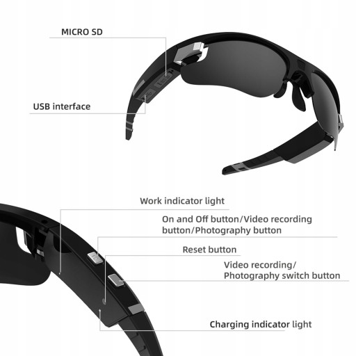 Okulary Przeciwsłoneczne Kamera Full HD 1080P Rejestrator Wideo Ochrona Oczu Do Wspinaczki Opis: Wideo HD: Nagrywaj wideo w rozdzielczości 1920x1080P, w formacie kompresji H264 i kliknij przycisk, aby łatwo przechwycić wideo z punktu widzenia HD Szybka akcja 30 klatek na sekundę: nagrywanie przy 30 klatkach na sekundę w rozdzielczości 1080P, brak opóźnień i rozmazań podczas jazdy na świeżym powietrzu; Obiektyw szerokokątny 120 °, rejestrujący szerszy obszar w filmie Funkcja robienia zdjęć: Naciśnij raz przycisk obsługi, aby zrobić zdjęcie podczas nagrywania filmu Okulary wibrują, informując Cię o zrobieniu zdjęcia Szerokie zastosowanie: w pełni naładowane okulary do aparatu mogą nagrywać 100-120 minut wideo Nadaje się do jazdy konnej, łucznika, polowania, wędkowania, podróżowania i innych sportów na świeżym powietrzu Świetne do szybkiego fotografowania i nagrywania akcji Maksymalna pamięć: Surropt TF (TF), 32 GB, 64 GB, 128 GB, 256G (maks) (karta pamięci nie jest dołączona)