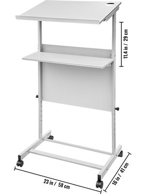 Regulowana stojąca mównica została zaprojektowana z dolną półką do przechowywania, która jest w stanie wytrzymać obciążenie do 20 kg. Dzięki temu możesz przechowywać narzędzia lub torby zgodnie z własnymi potrzebami. Płyta główna mównicy jest w stanie wytrzymać obciążenie do 10 kg, co pozwala na umieszczenie na niej komputera stacjonarnego.
