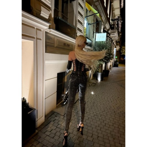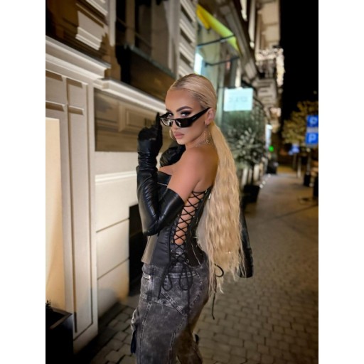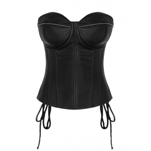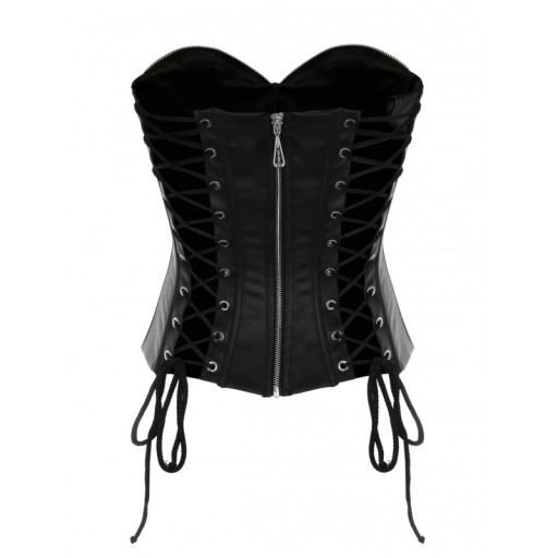 Gorset wykonany ze skóry ekologicznej w czarnym kolorze. Subtelny dekolt ze specjalnie wyodrębnionym miejscem na biust ozdobiony jest srebrnym zamkiem, który także znajduje się na miseczkach dodając charakteru! Model usztywniany wszytymi fiszbinami z przodu, po bokach oraz z tyłu, które modelują sylwetkę. Zapinany na srebrny suwak z tyłu z logowanym pullerem, a po jego bokach znajdują się wiązania. Dają one możliwość regulacji, dopasowania do siebie, jak i efektownie uwydatniają troszkę ciała. Model z czarną podszewką.