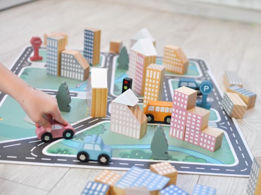 - w zestawie znajdziemy domki, drzewa, znaki, światła i samochodziki oraz makietę z widocznymi drogami oraz rzeką