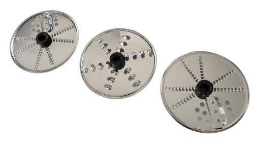 Tarcza tnąca posiada 2 zastosowania. Jedna strona pokroi warzywa na plasterki, druga strona używana jest do rozdrabniania warzyw, owoców i sera na małe wiórki.