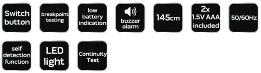 Funkcje lokalizowanie uszkodzeń w izolowanych przewodach pod napięciem przemiennym, sprawdzenie fazy w gniazdkach elektrycznych prądu przemiennego, lokalizowanie w ścianie pod tynkiem przewodów pod napięciem