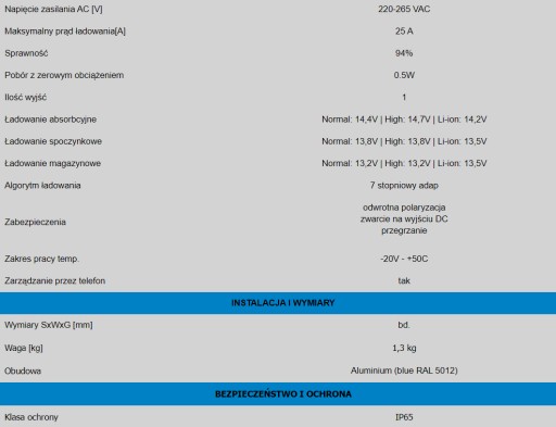 - Obsługiwane akumulatory: Kwasowe, bezobsługowe,CA/CA, EFB, AGM, GEL, Lithium, LifePo4