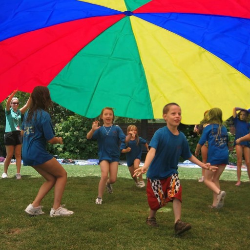 - BIEG JEDNĄ RĘKĄ – każde dziecko trzyma spadochron jedną ręką. Wyciągnij przeciwne ramię, aby zachować równowagę. Biegaj w jednym kierunku, a następnie zmieniaj się i biegaj w drugim. Inną odmianą może być użycie muzyki jako wskazówki do zmiany kierunku (tj. kierunek można zmieniać za każdym razem, gdy muzyka się zatrzyma.)