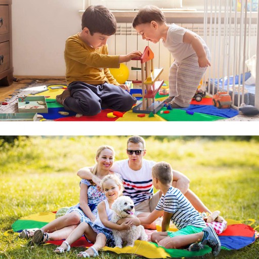 - Wzmocnione uchwyty spadochronu i środek siatki. Nie ulegnie zniszczeniu po wielokrotnym użytkowaniu, gdyż posiada dedykowaną torebkę! To nie tylko zabawka dla dzieci, ale także mata na stół, mata piknikowa czy mata do zabawy.