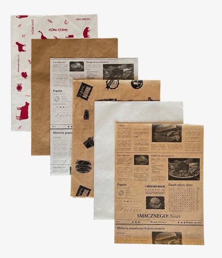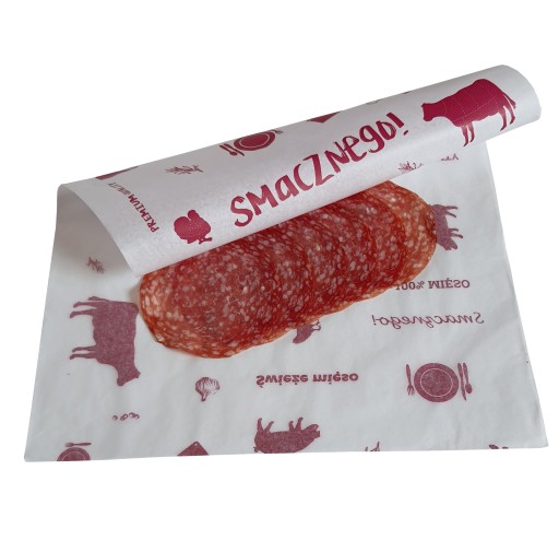 Ciesz się naszym nowym produktem - papierem w arkuszach z nadrukiem wędliny! Ten wysokiej jakości papier w arkuszach został stworzony z myślą o Twoich potrzebach. Jego rozmiar 30x40cm jest idealny do pakowania i prezentacji różnorodnych wędlin, serów, i innych smakołyków.