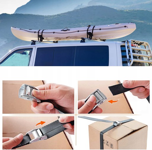 🔵 Funkcje: Wysoka jakość: wykonana z poliestru o wysokiej wytrzymałości, mocna i trwała. MOCNE: Pasy mocujące zapewniają bezpieczne trzymanie ładunków do 250 kg! Oznacza to, że Twoje towary pozostają bezpiecznie na miejscu podczas transportu i nigdy więcej nie musisz się o nie martwić! POMOCNE: Paski do wiązania są ciągnięte przez metalowe zapadki i napinane za pomocą dźwigni, aż do osiągnięcia naprężenia. Splot jest bardzo mocny!