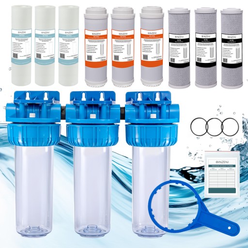 Zestaw składa się ze stelaża oraz trzech przezroczystych korpusów na wkłady filtrujące o standardowych wymiarach 10x2,5 cala.