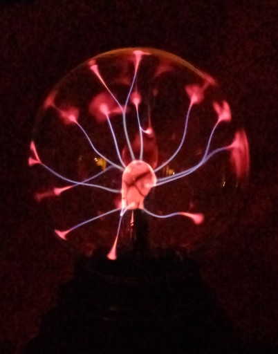Od centralnej elektrody w kierunku powierzchni kuli wiją się różowo czerwone wyładowania w kształcie błyskawic.