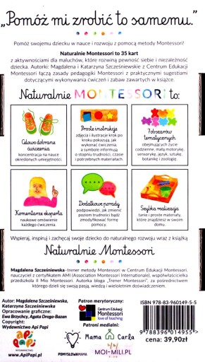 "Pomóż mi zrobić to samemu" Pomóż swojemu dziecku w nauce i rozwoju, z pomocą metody Montessori!Naturalnie Montessori to 35 kart z aktywnościami dla maluchów, które rozwiną pewność siebie i niezależność dziecka. Autorki Magdalena i Katarzyna Szcześniewskie z Centrum Edukacji Montessori, łączą zasady pedagogiki Montessori z praktycznymi sugestiami wykonywania ćwiczeń i zabaw, zawartych w książce. Naturalnie Montessori to: - Celowe ćwiczenia- koncentracja na nauce określonej umiejętności. - Proste instrukcje- zdjęcia i ilustracje krok po kroku pokazujące wykonanie ćwiczenia oraz symbole informujące o stopniu trudności, czasie i potrzebnych materiałach. - 7 obszarów tematycznych: życie codzienne, mała motoryka, sensoryka, język, sztuka, botanika i zoologia. - Komentarze eksperta- naukowe omówienie każdego ćwiczenia. - Dodatkowe porady- podpowiedzi jak zmienić poziom trudności bądź zmodyfikować pomoc - Szybka realizacja- tanie i proste materiały, które znajdziesz w swoim domu. Wspieraj, inspiruj i zachęcaj swoje dziecko do naturalnego rozwoju wraz z książką Naturalnie Montessori! Magdalena Szcześniewska- Trener metody Montessori w Centrum Edukacji Montessori, nauczyciel z certyfikatem AMI (Association Montessori Internationale), współwłaścicielka przedszkola Il Mio Montessori. Autorka bloga trenermontessori za pośrednictwem którego dzieli się swoją pasją, wiedzą i wieloletnim doświadczeniem.