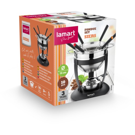 Zestaw do fondue LT7031 od marki Lamart nadaje się nie tylko do topienia sera i przygotowania mięsnych przysmaków, ale także do podgrzewania czekolady do słodkich przekąsek. Misa ze stali nierdzewnej doskonale nadaje się do równomiernego podgrzewania, a mocny palnik zapewnia idealne rozpuszczenie sera lub czekolady. Wykonano z najwyższej jakości stali nierdzewnej. W zestawie znajduje się pojemnik ze stali nierdzewnej, 6 widelców z uchwytem, stojak i palnik.