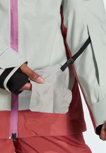 Dwie obszerne kieszenie boczne zapinane na suwaki, jedna na piersi oraz kieszonka na rękawie ze ściereczką do gogli i przegródką na SKIPASS