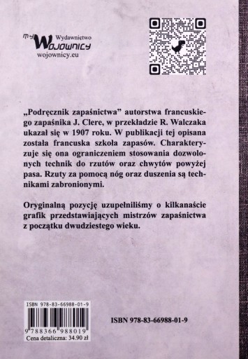 "Podręcznik zapaśnictwa" autorstwa francuskiego zapaśnika J. Clere, w przekładzie R. Walczaka ukazał się w 1907 roku. W publikacji tej opisana została francuska szkoła zapasów. Charakteryzuje się ona ograniczeniem stosowania dozwolonych technik do rzutów oraz chwytów powyżej pasa. Rzuty za pomocą nóg oraz duszenia są technikami zabronionymi. Oryginalną pozycję uzupełniliśmy o kilkanaście grafik przedstawiających mistrzów zapaśnictwa z początku dwudziestego wieku.