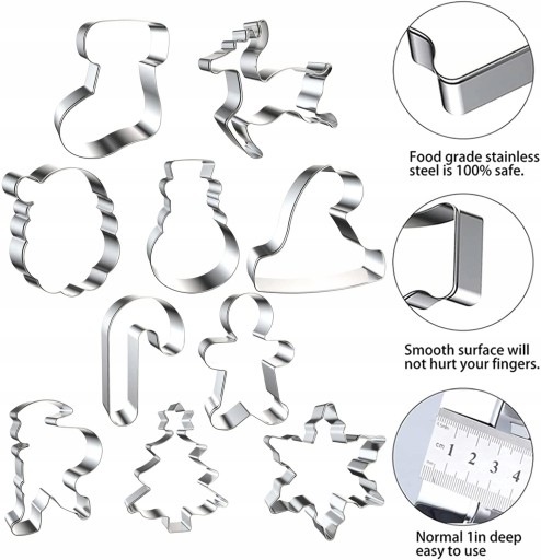 Zestaw foremek do ciastek świątecznych: 10 szt. foremek do ciastek w zestawie: piernikowy ludzik, święty mikołaj, choinka, bałwan, laska cukrowa, renifer i inne kształty do robienia ciastek domowych.