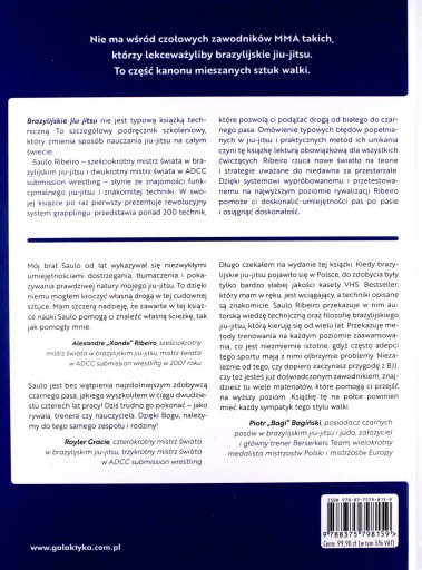 Nie ma wśród czołowych zawodników MMA takich, którzy lekceważyliby brazylijskie jiu-jitsu. To część kanonu mieszanych sztuk walki. SAULO RIBEIRO - sześciokrotny mistrz świata w brazylijskim jiu-jitsu i dwukrotny mistrz świata w ADCC submission wrestling - słynie ze znajomości funkcjonalnego jiu-jitsu i znakomitej techniki. W swojej książce Ribeiro po raz pierwszy dzieli się z czytelnikami rewolucyjnym systemem grapplingu, przedstawiając ponad 200 technik, które pozwolą ci podążać drogą od białego do czarnego pasa. Omówienie typowych błędów popełnianych w jiu-jitsu i praktycznych metod ich unikania czyni tę książkę lekturą obowiązkową dla wszystkich ćwiczących. Nawet podstawowe techniki ożywają dzięki Ribeiro, który rzuca nowe światło na teorie i strategie uważane do niedawna za przestarzałe. Dzięki systemowi wypróbowanemu i przetestowanemu na najwyższym poziomie rywalizacji Ribeiro oszlifuje twoje podstawowe umiejętności pas po pasie i pozwoli osiągnąć doskonałość. Brazylijskie jiu-jitsu. Od białego do czarnego pasa nie jest typową książką techniczną. To szczegółowy podręcznik szkoleniowy, który zmieni sposób nauczania jiu-jitsu na całym świecie.