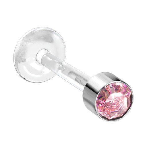 Labret wykonany z Bioplastu®, ozdobiony kryształkiem w srebrnej (pr. 925) oprawie w kształcie walca.