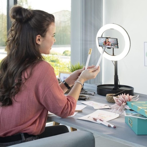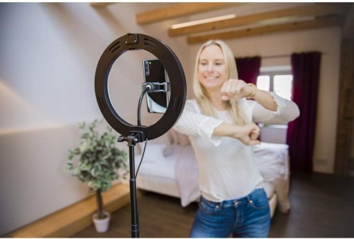 Lampa piercieniowa LED z 102 cala rednica zewntrzna 265 cm 128 diodami LED zdalnym wyzwalaczem Bluetooth i uchwytem na smartfon do nagrywania w formacie poziomympionowym Studio fotograficzne to go piercień wietlny mona zoy i schowa w podstawce idealny dla wszystkich blogerów i vlogerów którzy czsto podróuj Idealne owietlenie 3 temperatury barwowe i 10 poziomów jasnoci przycze zasilania za pomoc kabla USBA uchwyt na telefon komórkowy w razie potrzeby zdejmowany Pasuje do zdj i filmów w profesjonalnej jakoci np. Instagram TikTok Twitcha i wielu innych. Równie do samouczków lub portretów selfie Zakres dostawy 1 x lampa piercieniowa LED maks. wysoko 138 cm 1 x zdalny wyzwalacz Bluetooth 1 x abdzia szyja 1 x torba transportowa 1 x instrukcja obsugi Ostrzeenie Nie nadaje si dla dzieci poniej 14 roku ycia. Do uytku pod nadzorem osoby dorosej