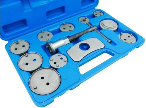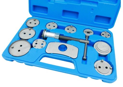- Profesjonalny 12-elementowy zestaw do cofania / wyciskania tłoczków w cylinderkach układów hamulcowych, niezbędny przy naprawach pojazdów wyposażonych w hamulce tarczowe.