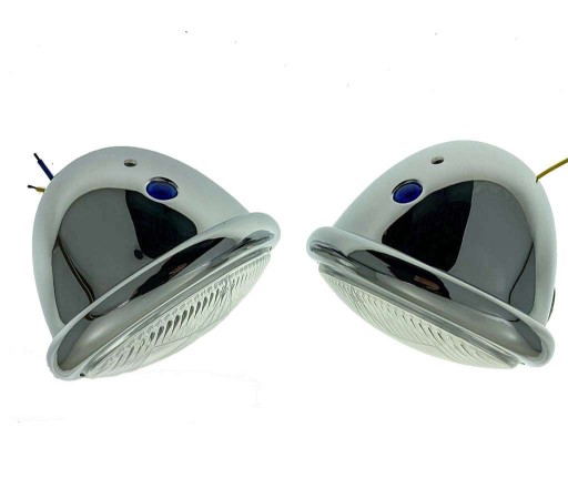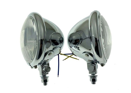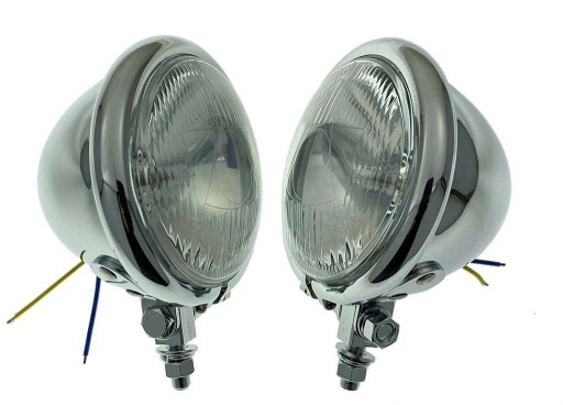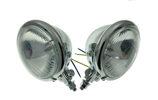 - Lampy są chromowane. Zaopatrzone są w żarówki H3 12V 55W oraz kontrolkę świecącą na niebiesko sygnalizującą świecenie lamp. Posiadają homologację europejską. Uchwyty umożliwiają zamocowanie lamp na stelażu oraz ustawienie kąta padania światła.