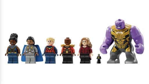 - Minifigurki słynnych postaci — zestaw zawiera minifigurki Kapitana Marvel, Okoye, Wandy Maximoff, Shuri i Walkirii, a także dużą figurkę Thanosa i mikrofigurkę Wasp