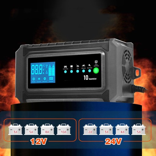 🚗 Ładowarka samochodowa 10 A: szybkie ładowarki samochodowe 12 V/10 A i 24 V/5 A ładują się znacznie szybciej niż ładowarki samochodowe 6 A. Wieloetapowe procesy ładowania z ładowaniem podtrzymującym i ładowaniem podtrzymującym chronią akumulator.
