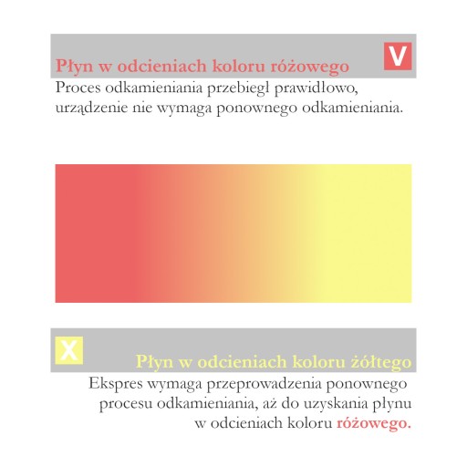 Wyjątkową cechą tego produktu jest indykator koloru, który pomaga w łatwym monitorowaniu procesu odkamieniania. Kolor płynu zmienia się, sygnalizując, kiedy proces odkamieniania jest zakończony, lub kiedy należy powtórzyć czynność, co zapewnia maksymalną efektywność czyszczenia. Jeżeli kolor płynu po odkamienianiu zostanie bez zmiany, czyli będzie czerwony, oznacza to, że proces odkamieniania został zakończony powodzeniem. Jeżeli natomiast po procesie odkamieniania płyn zmienił kolor na żółty, to cały proces odkamieniania należy powtórzyć. Takie rozwiązanie ułatwia utrzymanie ekspresu do kawy w idealnym stanie przez długi czas.