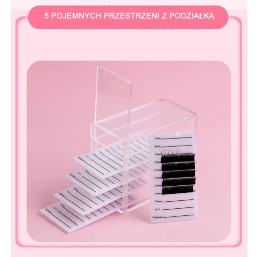 - Pojemnik posiada 5 pojemnych przestrzeni z podziałką na rzęsy.