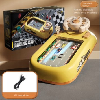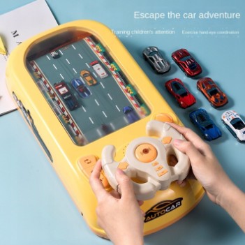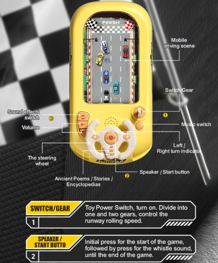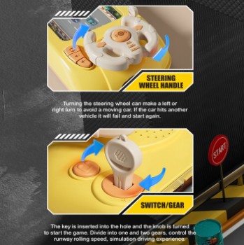 Steruj kierownicą w przód i w tył, aby samochód płynnie przejechał przez środek. Symulacyjna kierownica jest wyposażona w pokrętło do przyspieszania ruchu na scenie, dzieci mogą podciągnąć prawą dźwignię, aby zwiększyć prędkość samochodu i trudność gry podczas gry, ekscytującej i pełnej zabawy.