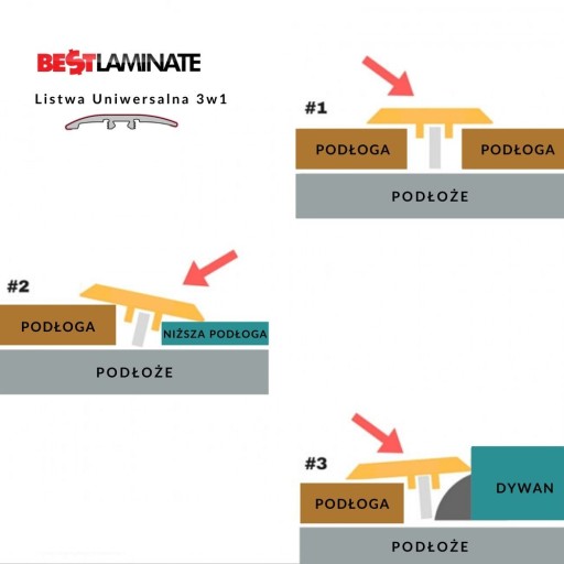 Listwa uniwersalna przeznaczona jest do wykończenia podłogi. Idealnie sprawdzi się przy wykończeniu podłogi marki Bestlaminate, ale może być stosowana również z podłogami innych marek. Listwa jest wodoodporna, wykonana z PCV, wytrzymała i odporna na promienie UV. Pełni ona trzy funkcje wykończenia: fugową, redukcyjną oraz dylatacyjną.