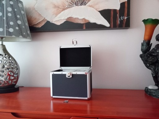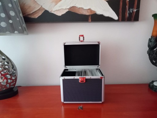 Bezpieczne koperty wykonane z miękkiej fizeliny chronią nośniki przed porysowaniem kufer jest poręczny. Kufer chroni płyty przed zgnieceniem, zarysowaniem kurzem i brudem. Wyposażony jest w zamek z kluczykiem. Wkładki wykończone fizeliną, aby nie rysowały nośnika płyt.