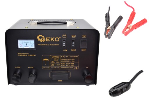 Jeśli zależy nam na efektywnym ładowaniu ogniwa, wybierając prostownik, trzeba koniecznie zwrócić uwagę na skuteczny prąd ładowania - nie może on być mniejszy niż 1/10 pojemności akumulatora. Dla przykładu akumulator 60 Ah należy ładować prądem 6 A przez 10 godzin. Prostownik szybkiego ładowania GEKO G80022 to niezawodne urządzenie służące do ładowania akumulatorów wykorzystując do tego napięcie 12V i 24V - doskonały prostownik do ładowania ogniw zarówno w samochodach osobowych, ciężarowych jak i w maszynach budowlanych. Wyposażony jest w amperomierz oraz bezpieczniki, które zabezpieczają urządzenie przed uszkodzeniem. Umożliwia ładowanie akumulatorów o pojemności od 20 Ah do 400 Ah.