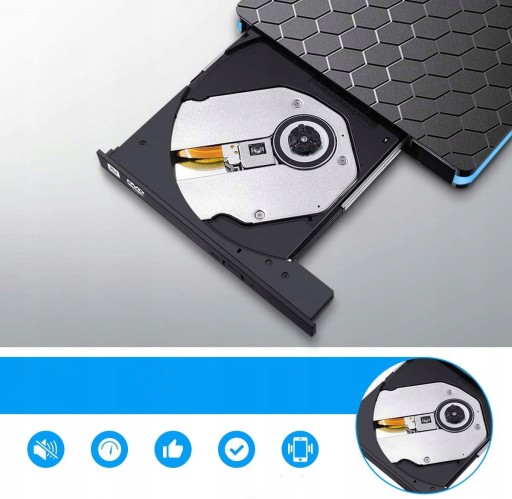 Unikalna inteligentna technologia nagrywania, zewnętrzna nagrywarka DVD/CD przyjmuje nowy układ, który ma silną zdolność korekcji błędów, redukcję wibracji i szumów oraz niskie zużycie energii. Odtwarzaj muzykę i filmy bez opóźnień i zniekształceń.