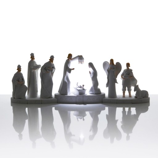 Oferujemy szopkę bożonarodzeniową z poświetleniem ledowym. Szopka składa się z 9 figurek które można dowolnie ustawiać. Figurki utrzymane są w ciepłej, białej kolorystyce, jedynie twarze i włosy zostały pomalowane ale utrzymane w stylizowanej, uproszczonej formie. Szaty postaci subtelnie zdobione reliefem.