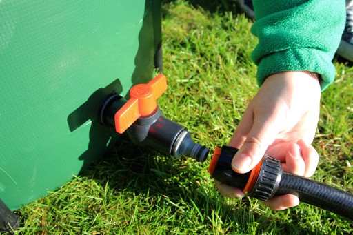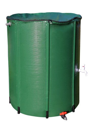 Pojemnik na wodę deszczową został wykonany z materiału PCV, wytrzymałego na niekorzystne warunki atmosferyczne.