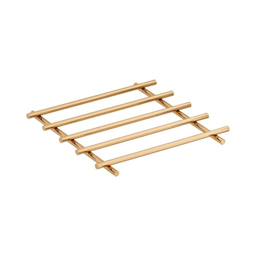 Podstawka METLEX to produkt wykonany w złotej kolorystyce. Na jego prosty design składają się jedynie dwie podłużne nóżki, na których położone zostały cztery prostokątne ''rurki'' tworzące podstawkę. To minimalistyczny, kuchenny dodatek, ale zapewniamy, że swoim wyglądem i funkcjonalnością spełni Twoje wymagania. Wymiary produktu wynoszą 20x20cm.