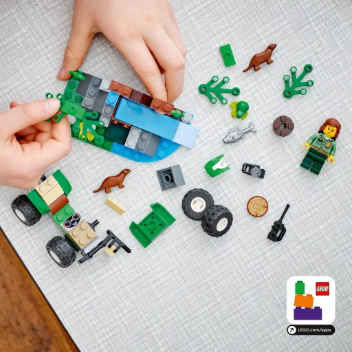 - Odkrywaj – dzieci mogą posadzić minifigurkę strażnika za kierownicą quada i wyruszyć na poszukiwania zwierząt