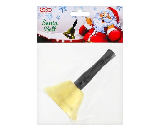 Metalowy dzwonek świąteczny o wysokości 12,5 cm to kluczowy element rekwizytu przebrania Świętego Mikołaja. Jego złoty kolor i solidna, czarna rączka z tworzywa sztucznego nadają mu charakterystyczny wygląd.