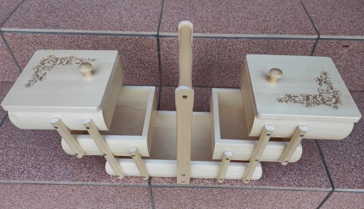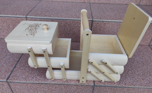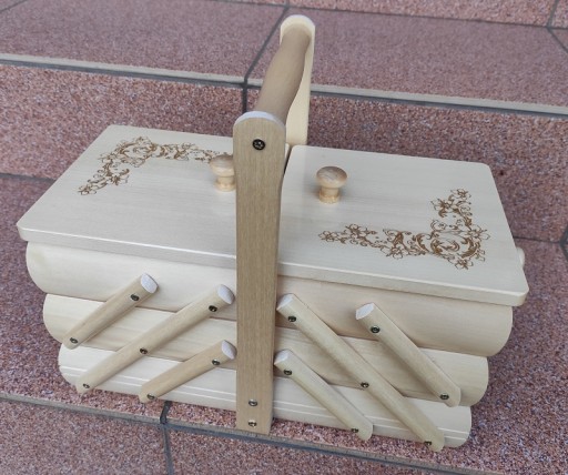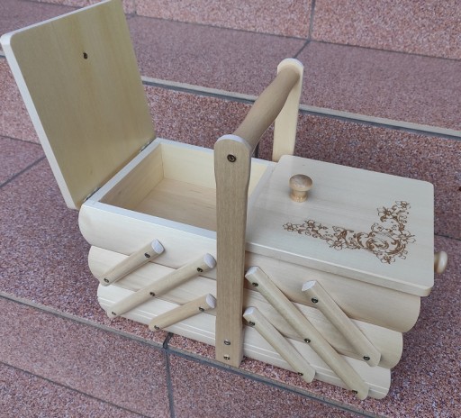 Kuferek idealnie służy do przechowywania nici i innych wyrobów pasmanteryjnych, może także służyć do przechowywania biżuterii, kosmetyków i innych drobiazgów.