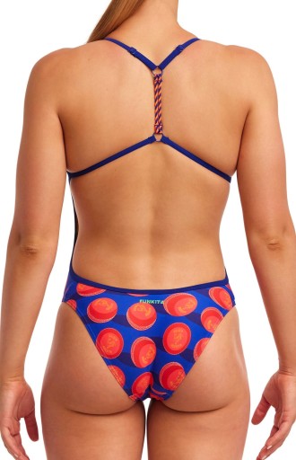 Twisted - najbardziej odkryty i wycięty z modeli dostępnych w kolekcji Funkita. Plecy są mocno odkryte, a boki odkryte. Wycięcie w biodrach wysokie, dzięki czemu masz pełną swobodę ruchów w wodzie. W przedniej części stroju jest podszewka dla lepszego krycia i komfortu noszenia.