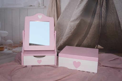 Szuflada pod lusterkiem pomieści wszystkie akcesoria upiększające małej modnisi: szczotkę, gumki do włosów, kolorowe spinki, bransoletki, korale itp.