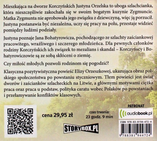 Klasyczna pozytywistyczna powieść Elizy Orzeszkowej, ukazująca obraz polskiego społeczeństwa po powstaniu styczniowym. Tłem powieści jest świat dworów i zaścianków szlacheckich na Litwie, a głównymi motywami ciężka praca oraz praca u podstaw, polityka caratu wobec Polaków po powstaniach i przełamywanie konfliktów klasowych. Mieszkająca na dworze Korczyńskich Justyna Orzelska to uboga szlachcianka, która nieszczęśliwie zakochała się w swoim bogatym kuzynie Zygmuncie. Matka Zygmunta nie aprobowała jego związku z dziewczyną, więc ją porzucił. Justyna postanawia być niezależna, uczy się pracy na polu, przestaje widzieć pomiędzy ludźmi podziały. Justyna poznaje Jana Bohatyrowicza, pochodzącego ze szlachty zaściankowej pracowitego, wrażliwego i szczerego młodzieńca. Dla pewnych członków rodziny Korczyńskich ich związek to mezalians i skandal - Korczyńscy i Bohatyrowiczowie są ze sobą skłóceni o ziemię. Czy miłość młodych pozwoli rodzinom się pogodzić?