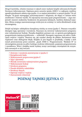 Drogi Czytelniku, właśnie trzymasz w rękach nowe wydanie książki zaliczanej do klasyki literatury informatycznej. Napisana przez autorów języka ANSI C w najlepszy możliwy sposób przedstawia arkana tego języka. A co można powiedzieć o samym języku? To też klasyka. To język wymagający systematyczności i skupienia, ale dający w zamian wiele możliwości i świetne wyniki. To najczęściej nauczany język programowania - jego znajomość stanowi znakomity fundament do poznania kolejnych, bardziej złożonych języków. Mimo swojego zaawansowanego wieku jest on ceniony i w wielu dziedzinach wciąż niezastąpiony.