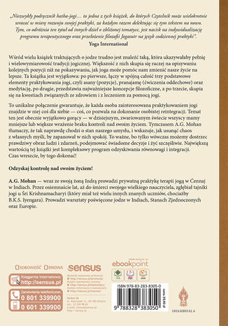 Wśród wielu książek traktujących o jodze trudno jest znaleźć taką, która ukazywałaby pełnię i wielowymiarowość tradycji jogicznej. Większość z nich skupia się raczej na opisywaniu kolejnych pozycji niż na pokazywaniu, jak joga może pomóc nam zmienić nasze życie na lepsze. Ta książka jest wyjątkowa: po pierwsze, łączy w spójną całość trzy podstawowe elementy praktykowania jogi, czyli asany (pozycje), pranajamę (ćwiczenia oddechowe) oraz medytację, po drugie, przedstawia najważniejsze koncepcje filozoficzne, a po trzecie, skupia się na kwestiach związanych ze zdrowiem i leczeniem za pomocą jogi.To unikalne połączenie gwarantuje, że każda osoba zainteresowana praktykowaniem jogi znajdzie w niej coś dla siebie -- coś, co pozwala na dokonanie osobistej reintegracji. Temat ten jest obecnie wyjątkowo gorący -- w dzisiejszym zwariowanym świecie wszyscy mamy mniejsze lub większe wrażenie braku kontroli nad swoim życiem. Tymczasem A.G. Mohan tłumaczy, że tak naprawdę chodzi o stan naszego umysłu, i wskazuje, jak usunąć chaos z własnych myśli, by zapanował w nich spokój. To ważne, bo tylko wówczas możemy dostrzegać prawdziwy obraz ludzi i zdarzeń, podejmować świadome decyzje i żyć szczęśliwie. Największą wartością tej książki jest kompleksowy program odzyskiwania równowagi i integracji. Czas wreszcie, by tego dokonać!