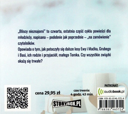 "Bliscy nieznajomi" to czwarta, ostatnia część cyklu powieści dla młodzieży, napisana - podobnie jak poprzednie - "na zamówienie" czytelników. Opowiada o tym, jak potoczyły się dalsze losy Ewy i Maćka, Grubego i Basi, ich rodzin i przyjaciół, małego Tomka. Czy wszystkie związki okażą się trwałe?