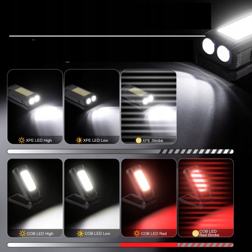 7 trybów oświetlenia Lampa robocza LED: warsztatowa lampa robocza LED ma 7 trybów świecenia: Latarka LED jasna/przyciemniona/stroboskopowa. Lampa COB jasna/przyciemniona/czerwone światło/SOS
