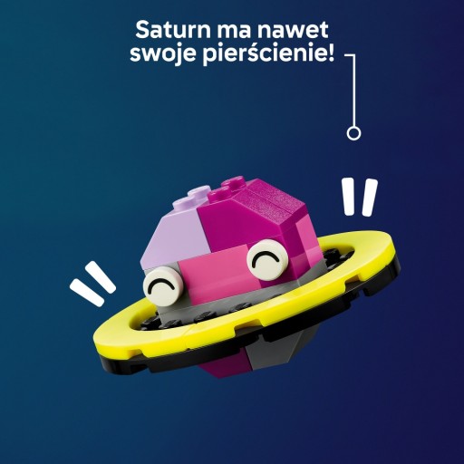 Dzieci układają kolorowe klocki, aby zbudować zabawkową rakietę, kosmitę, astronautkę i mały układ słoneczny obejmujący Marsa, Ziemię, Słońce i Saturna z pierścieniami. Modele kosmiczne można następnie przebudować, korzystając z innych kolorów, kształtów, oczu, min i podstawki, dzięki której można obracać model. W zestawie są także klocki świecące w ciemności. Kosmiczna kreatywność nie musi się kończyć, bo dzieci mogą przebudować modele na układ słoneczny składający się z ośmiu planet. Przewodniki i cyfrowe dodatki są dostępne również w aplikacji LEGO Builder.