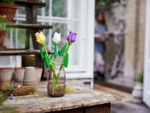 - Zestaw zawiera trzy różnokolorowe tulipany do zbudowania z regulowanymi łodygami.