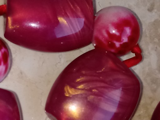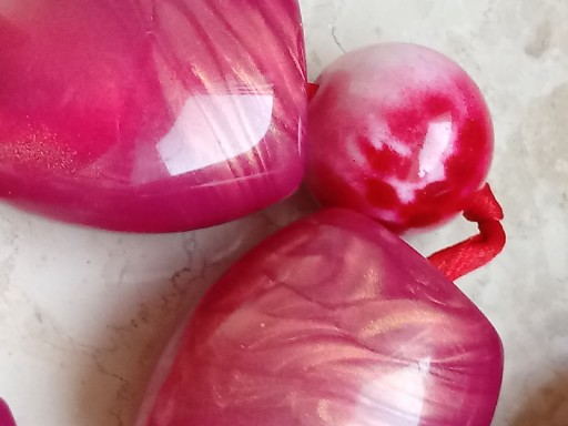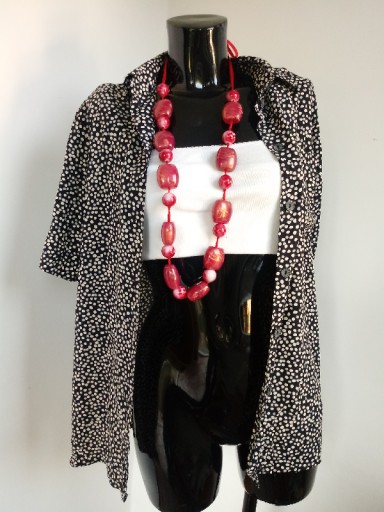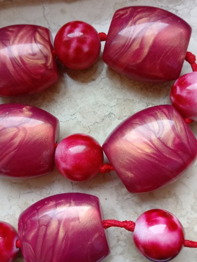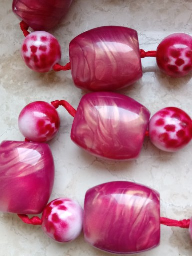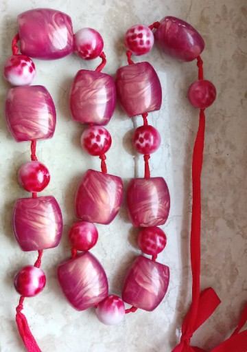 Korale wykonane z plastikowych koralików w kolorze malinowym. Zapięcie na tasiemce, ładnie prezentują się na żywo.